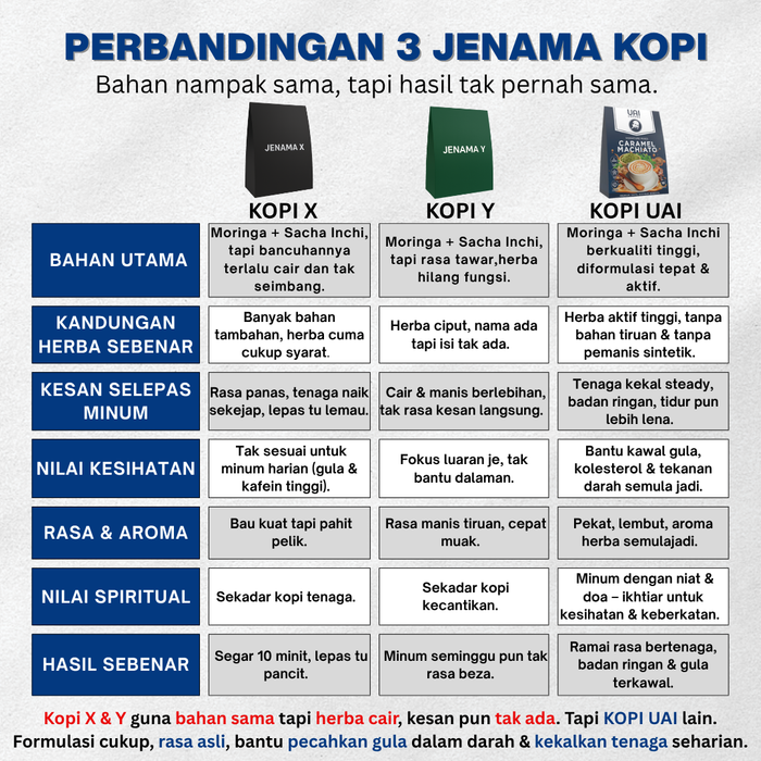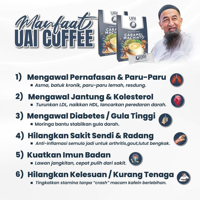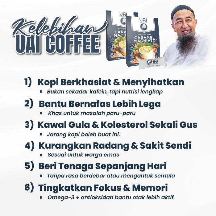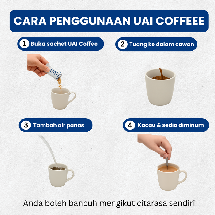 UAI Coffee ialah minuman kopi herba untuk kegunaan harian. Ia bukan ubat dan tidak bertujuan untuk mendiagnosis, merawat, atau menyembuhkan sebarang penyakit.